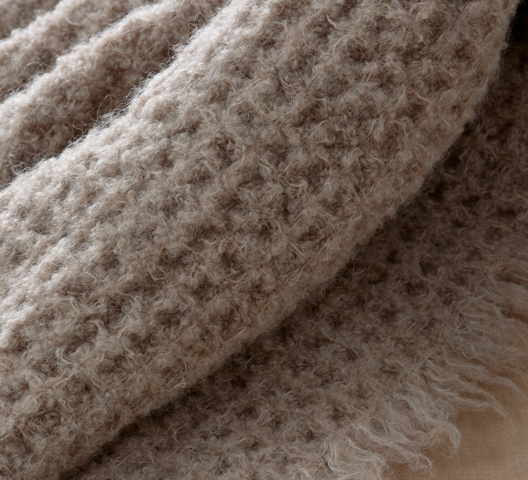 PON is a throw in boucle alpaca, presenting a new interpretation of the iconic waffle weave finishing. Cosy and soft to the touch, it looks unique thanks to the macro embossed tone-on-tone texture. The material, almost impalpable, feels light but still maintains a soft and warm touch.