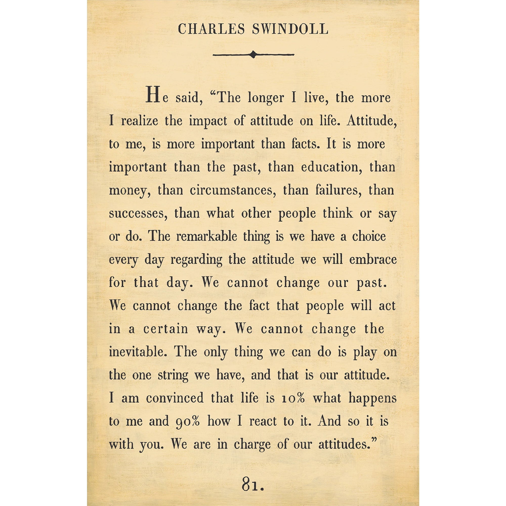 Charles Swindoll is an evangelical Christian pastor, author, radio broadcaster, and educator. He is the founder of Insight for Living in Frisco, Texas, which reaches more than 2,000 stations around the world in 15 different languages. His namesake art print reads the following sentiment: