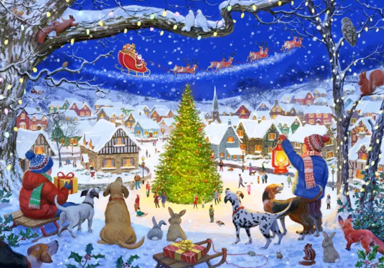 This exclusive illustration, commissioned for Wentworth Puzzles is full of winter wonder, from the falling snow to the star-lit sky and Santa in his sleigh.