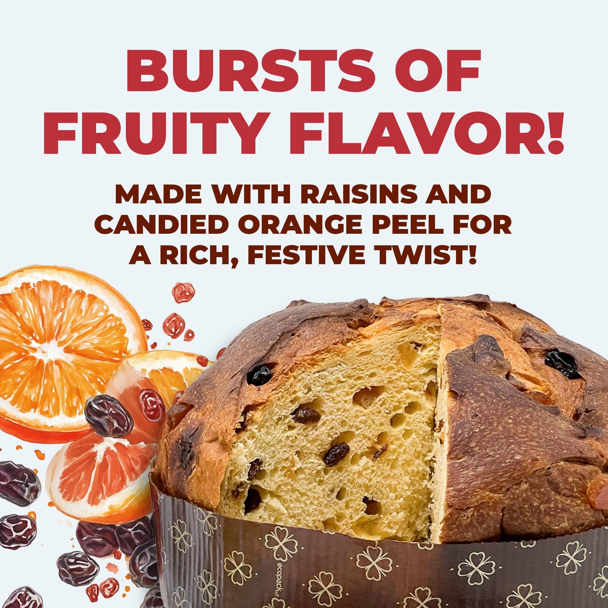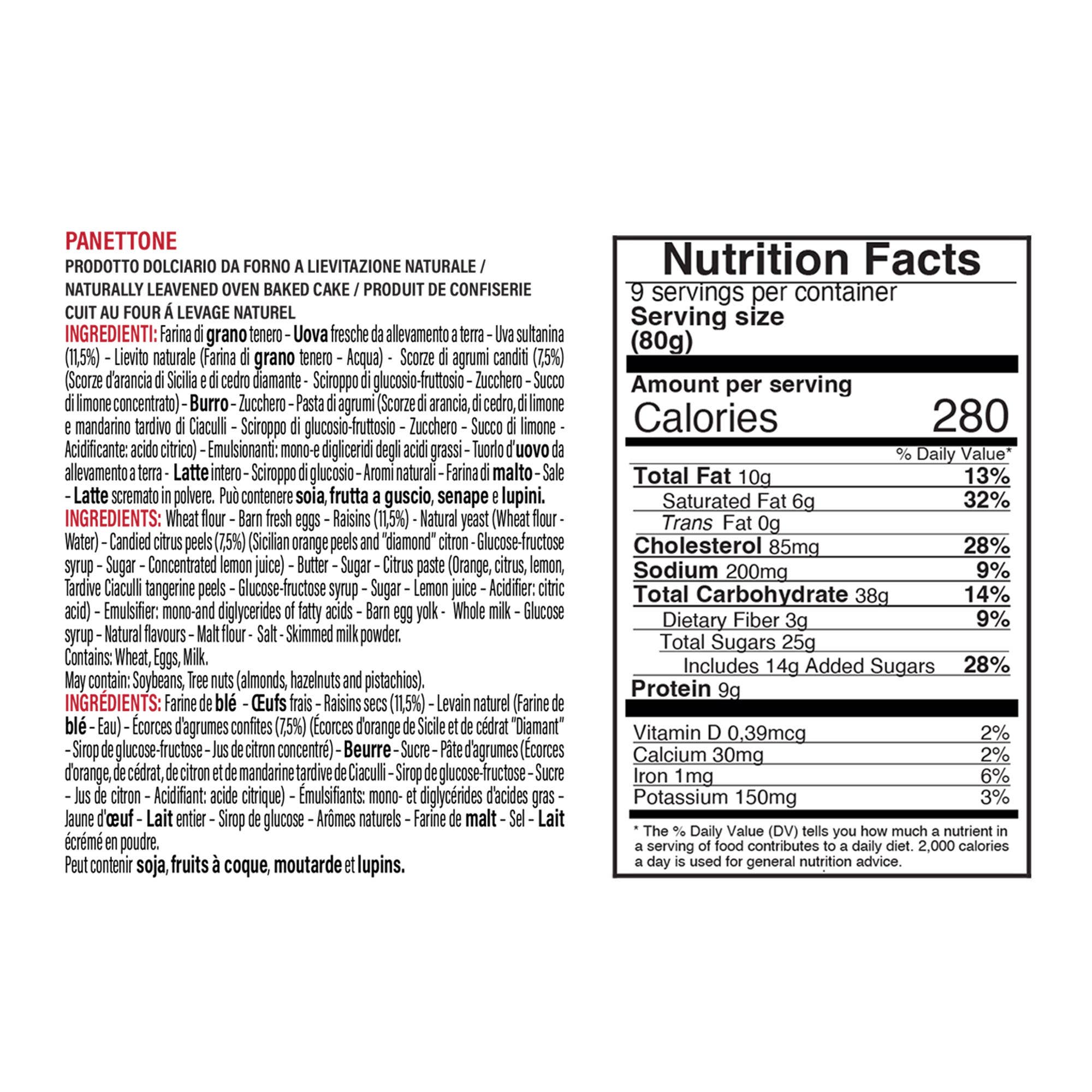 This classic panettone is made with select wheat flour, fresh eggs, real butter, and natural sourdough starter. It offers a source of simple carbohydrates for quick energy and includes a small amount of protein from eggs. Natural dried fruit provides trace amounts of vitamins and minerals, including potassium and vitamin C from the orange peel. Free from artificial colors and preservatives, it's a wholesome way to celebrate or treat yourself.